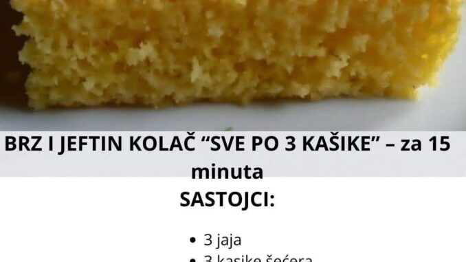 Na osnovu slike, ovo je recept za Brzi i jeftin kolač “Sve po 3 kašike”, za koji je potrebno svega 15 minuta pripreme.