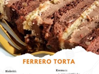 FERRERO ROCHER TORTA Broj porcija: 12–14 Vreme pripreme: 1 sat + hlađenje Vreme pečenja: 25–30 min Težina: Srednje zahtevno SASTOJCI Za koru (3 kore): 6 belanaca 150 g šećera 150 g pečenih, mlevenih lešnika 3 […]