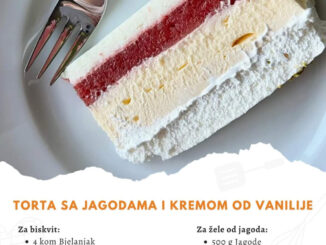 Sastojci Biskvit: 4 jaja 120 g šećera 1 vanilin šećer 120 g brašna 1 kašičica praška za pecivo Vanila krem: 500 ml mleka 1 kesica pudinga od vanile 3 kašike šećera 200 ml slatke pavlake […]