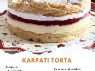 Sastojci: Kora: 5 belanaca 5 kašika šećera 100 g kokosa 2 kašike brašna 1/2 praška za pecivo Fil: 5 žumanaca 5 kašika šećera 2 kašike brašna 300 ml mleka 125 g margarina ili maslaca 100 […]