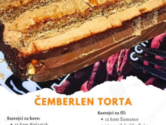 Čembrlen torta – Recept Kore (3 kore): 6 belanaca 6 kašika šećera 2 kašike brašna 100 g mlevenih oraha 1 kašičica praška za pecivo Priprema kora: Umutiti belanca u čvrst sneg, postepeno dodajući šećer. Lagano […]