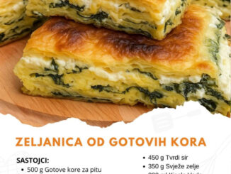 SASTOJCI: Za pitu: 500 g tankih kora za pitu (kupovne, obično 1 pakovanje) 500 g blitve ili spanaća (može i mešavina) 200 g sitnog sira (ili feta, mladi kravlji sir) 2 jaja 100 ml kisele […]