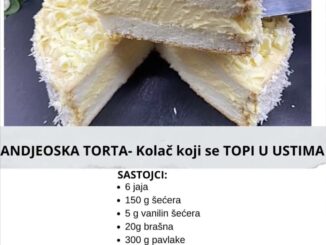 🕊️ ANĐEOSKA TORTA Sastojci Za korice: 6 belanaca 150 g šećera 5 g vanilin šećera 20 g brašna Za fil: 6 žumanaca 300 g pavlake (slatke, 30% m.m.) 70 g šećera 70 g brašna 80 […]