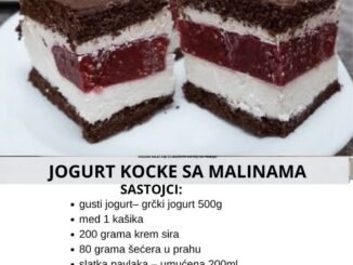 🍰 Jogurt kocke sa malinama Sastojci Za biskvit (donja podloga): 4 jaja 120 g šećera 100 ml ulja 100 ml mleka 200 g brašna 1 prašak za pecivo 1 kašičica vanilin šećera Za krem: 500 […]