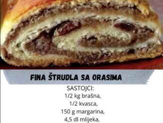 🍰 Fina štrudla sa makom Sastojci Za testo: 500 g brašna (tip 400 ili 500) 250 ml mleka (mlako) 80 g šećera 1 kockica svežeg kvasca (40 g) ili 1 kesica suvog (7 g) 80 […]