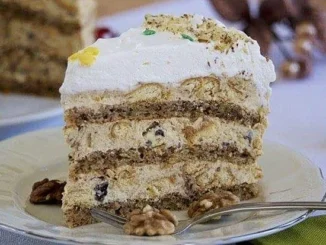 Za 3 kore: – 12 bjelanjaka – 27 žlica šećera – 12 žlica mljevenog plazma keksa – 15 žlica oraha Za kremu: – 12 žumanjaka – 200 g šećera – 2 pudinga od vanilije – […]