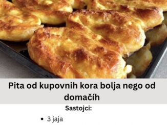 🧂 Sastojci: 3 jaja 1 kašičica soli (ili po ukusu) 1 čaša ulja (200 ml) 1 čaša jogurta (200 ml) 1 prašak za pecivo ½ čaše brašna 1 pakovanje kupovnih kora za pitu (Opcionalno: sir, […]