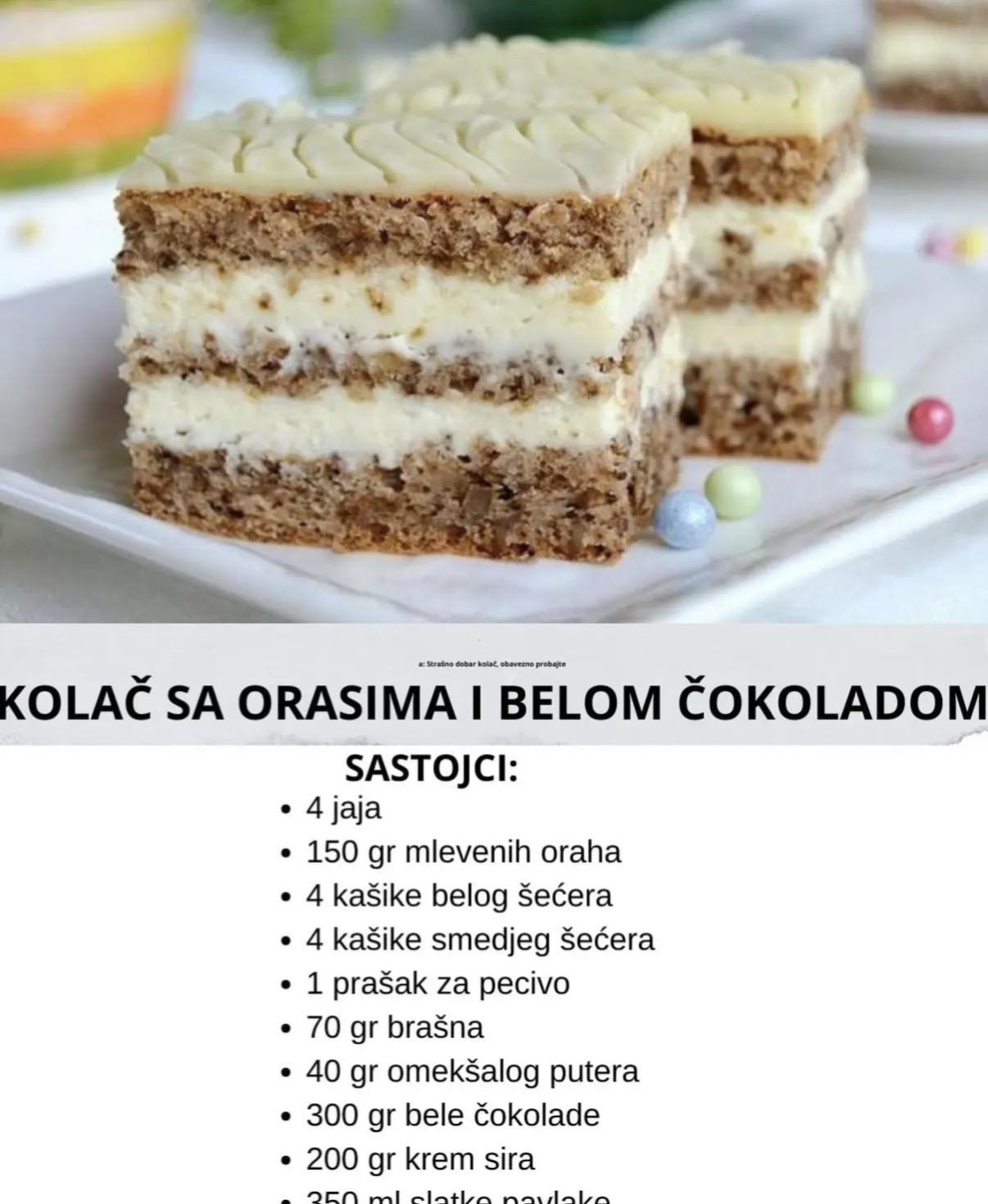 š„®Ā KOLAÄ SA ORASIMA I BELOM ÄOKOLADOM šĀ Sastojci Za koru: 5 belanaca 5 kaÅ”ika Å”eÄera 100 g mlevenih oraha 2 kaÅ”ike braÅ”na 1 kaÅ”iÄica praÅ”ka za pecivo prstohvat soli Za fil 1 (beli krem sa Äokoladom): 5 žumanaca 100 g Å”eÄera 200 g bele Äokolade 250 g maslaca ili margarina Za fil 2 (orah … Read more