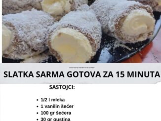 🍰 SLATKA SARMA – RECEPT 🧺 Potrebni sastojci Za fil: 300 g mlevenog keksa (npr. Plazma ili Petit Beurre) 200 g mlevenih oraha (može i lešnik po želji) 150 g šećera 2 kašike kakao praha […]