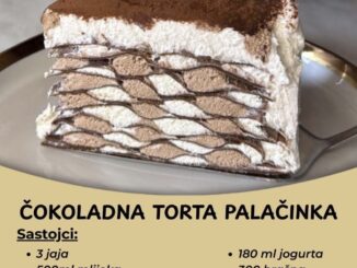 ČOKOLADNA TORTA PALAČINKA Sastojci: Palačinke 3 jaja 300 g brašna 345 ml mleka 330 ml kisele vode 75 ml ulja prstohvat soli 30 g kakao praha (od ove smese dobije se oko 12 palačinki, za […]