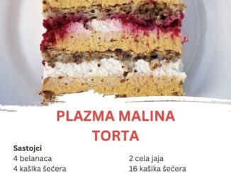 🍓 Plazma malina torta (bez pečenja) 🧺 Sastojci Kora: 300 g mlevene plazme 120 g otopljenog putera (ili margarina) 100 ml mleka (po potrebi – da masa bude kompaktna) Fil: 500 g maskarpone sira (ili […]