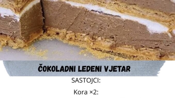 Čokoladni ledeni vjetar je varijacija popularnog kolača „Ledeni vjetar“, poznatog po kremastim filovima i laganom, prozračnom ukusu. U ovoj verziji dominira čokolada, pa je kolač prava poslastica za ljubitelje bogatog, a opet osvežavajućeg deserta. Ne peče se dugo, sastoji se od laganih kora i slojeva kreme sa čokoladom, šlagom i voćem (najčešće banane, jagode i kivi), što ga čini i vizuelno i ukusno savršenim.