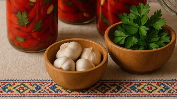 Dok se paprike hlade, pripremite tegle. Temeljito ih operite i sterilizirajte (možete ih kuhati ili ih zagrijati u pećnici na 100°C oko 15 minuta). Očistite bijeli luk i narežite ga na listiće. Sitno nasjeckajte peršun.