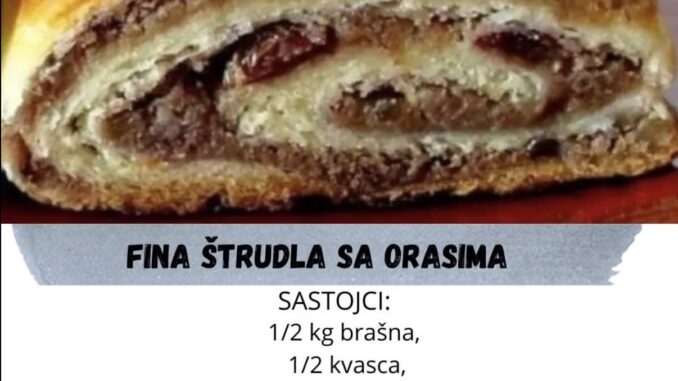 - Peći u prethodno zagrejanoj rerni na 180°C oko 35–40 minuta, dok štrudla ne dobije lepu zlatno-smeđu boju.
